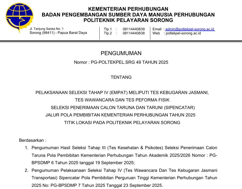 - PELAKSANAAN SELEKSI PSIKOTES DAN SELEKSI KESEHATAN SIPENCATAR JALUR POLA PEMBIBITAN KEMENTERIAN PERHUBUNGAN TAHUN 2025 TITIK LOKASI PADA POLITEKNIK PELAYARAN SORONG