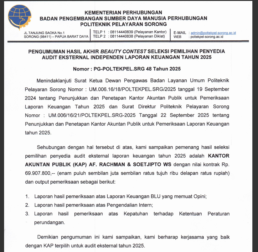 - PENGUMUMAN HASIL SELEKSI PENYEDIA JASA AUDIT EKSTERNAL (KAP) UNTUK AUDIT LAPORAN KEUANGAN BLU POLITEKNIK PELAYARAN SORONG TAHUN 2025